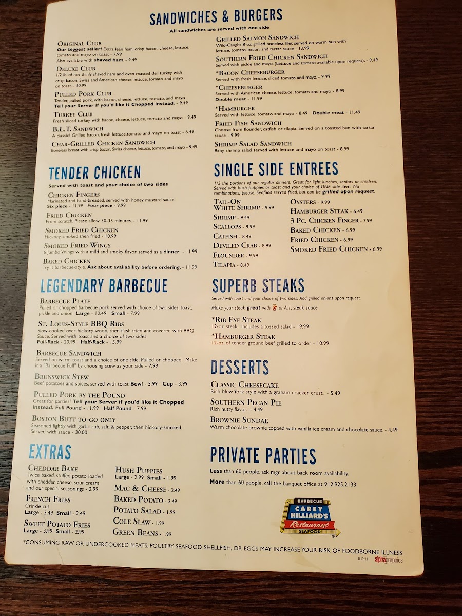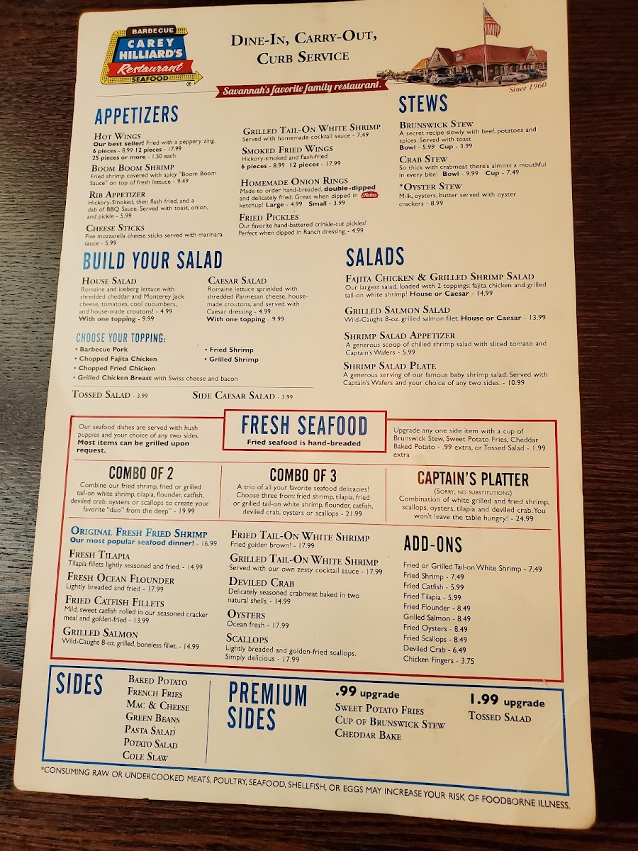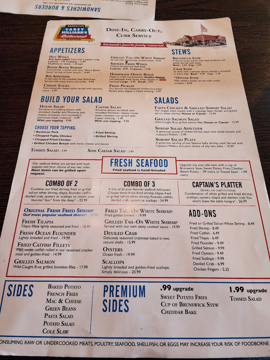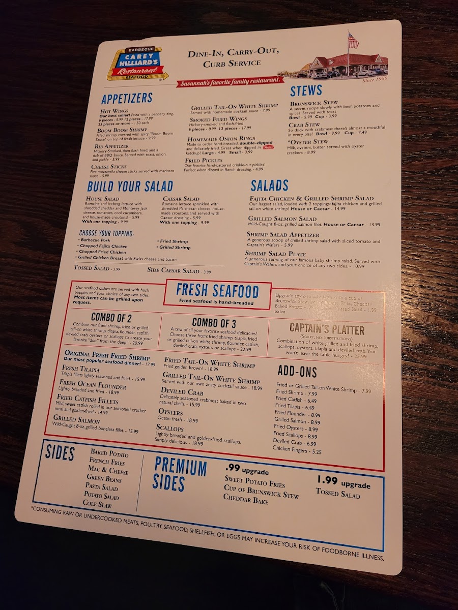 Introducing Carey Hilliard's Restaurant, a charming destination tucked away at 198 Pooler Pkwy, Pooler, GA, dedicated to delivering flavorful Southern fare with warm hospitality. The menu showcases a delightful array of appetizers, from the smoky 6pc. Smoked Fried Wings to the enticing Boom Boom Shrimp, drizzled with a creamy spice that sparks interest. Special offerings highlight the Grilled Tail-On White Shrimp, a chef's recommendation perfect for health-conscious diners.