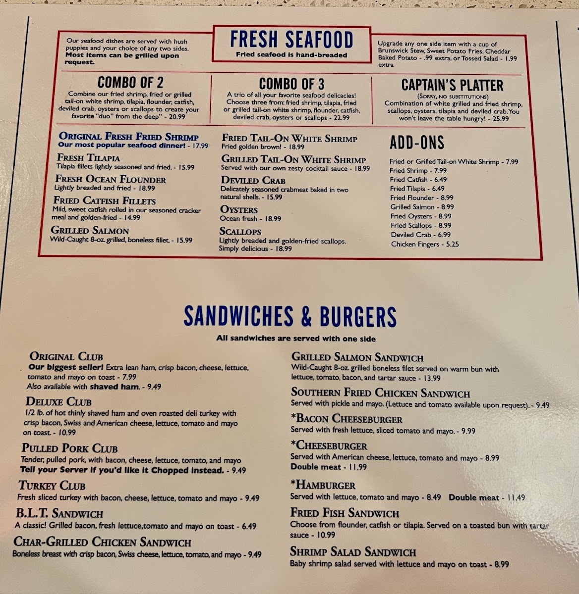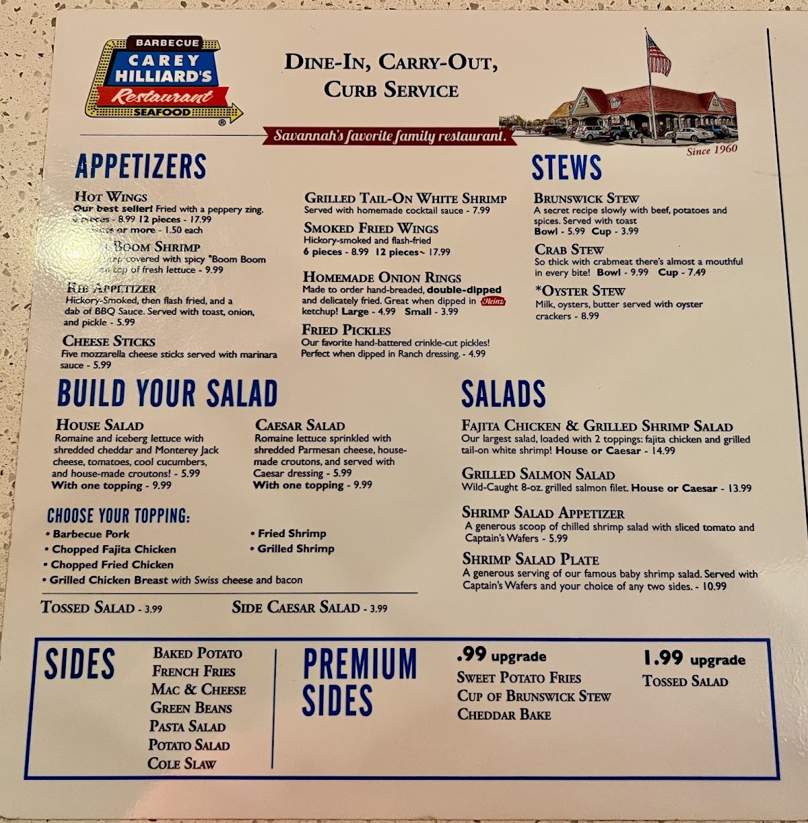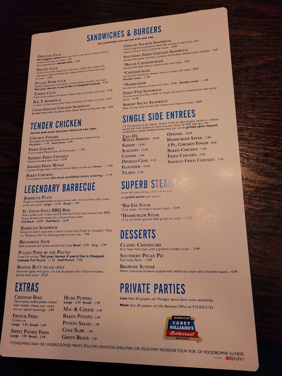 Introducing Carey Hilliard's Restaurant, a charming destination tucked away at 198 Pooler Pkwy, Pooler, GA, dedicated to delivering flavorful Southern fare with warm hospitality. The menu showcases a delightful array of appetizers, from the smoky 6pc. Smoked Fried Wings to the enticing Boom Boom Shrimp, drizzled with a creamy spice that sparks interest. Special offerings highlight the Grilled Tail-On White Shrimp, a chef's recommendation perfect for health-conscious diners.